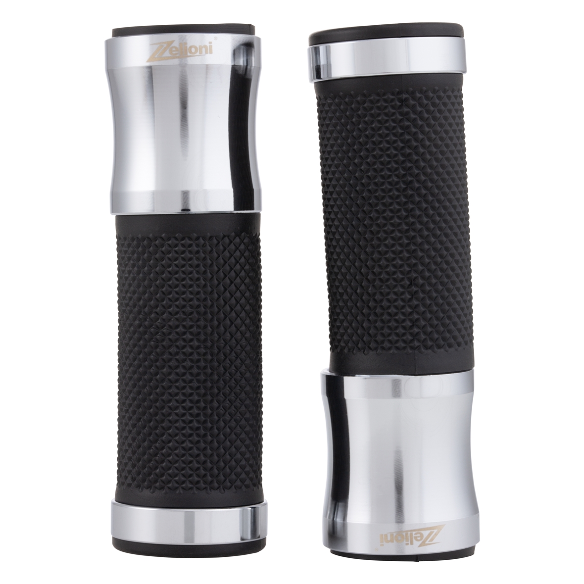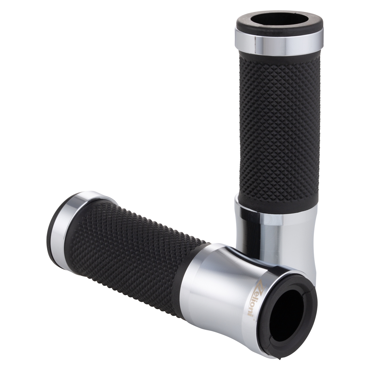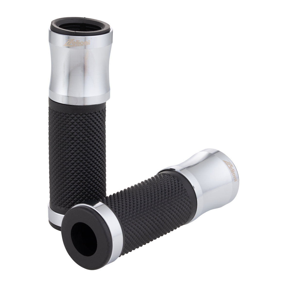 Poignée ergonomique avec paume caoutchoutée. Bouchons en aluminium avec logo ZELIONI gravé au laser. Extrémités ouvertes pour le montage de poids/miroirs d'extrémité de guidon.