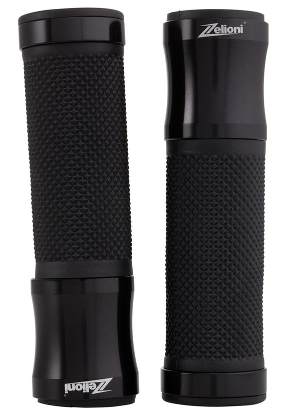 Poignée ergonomique avec paume caoutchoutée. Bouchons en aluminium avec logo ZELIONI gravé au laser. Extrémités ouvertes pour le montage de poids/miroirs d'extrémité de guidon.