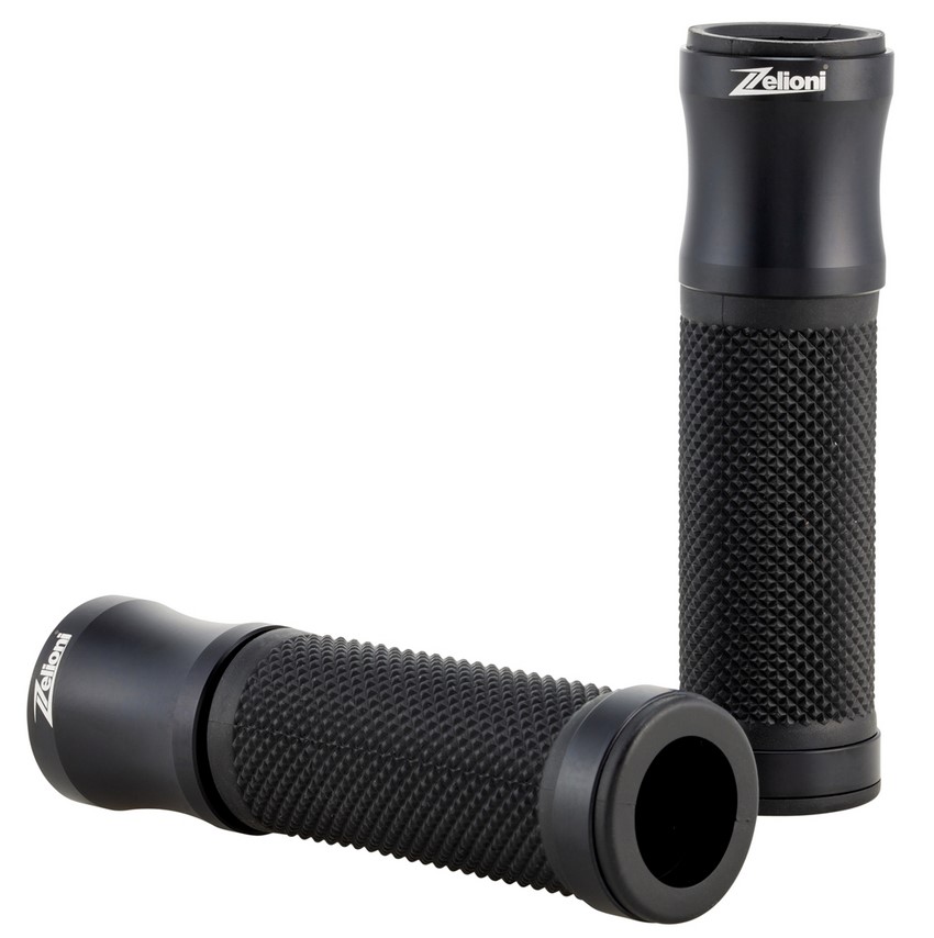 Poignée ergonomique avec paume caoutchoutée. Bouchons en aluminium avec logo ZELIONI gravé au laser. Extrémités ouvertes pour le montage de poids/miroirs d'extrémité de guidon.