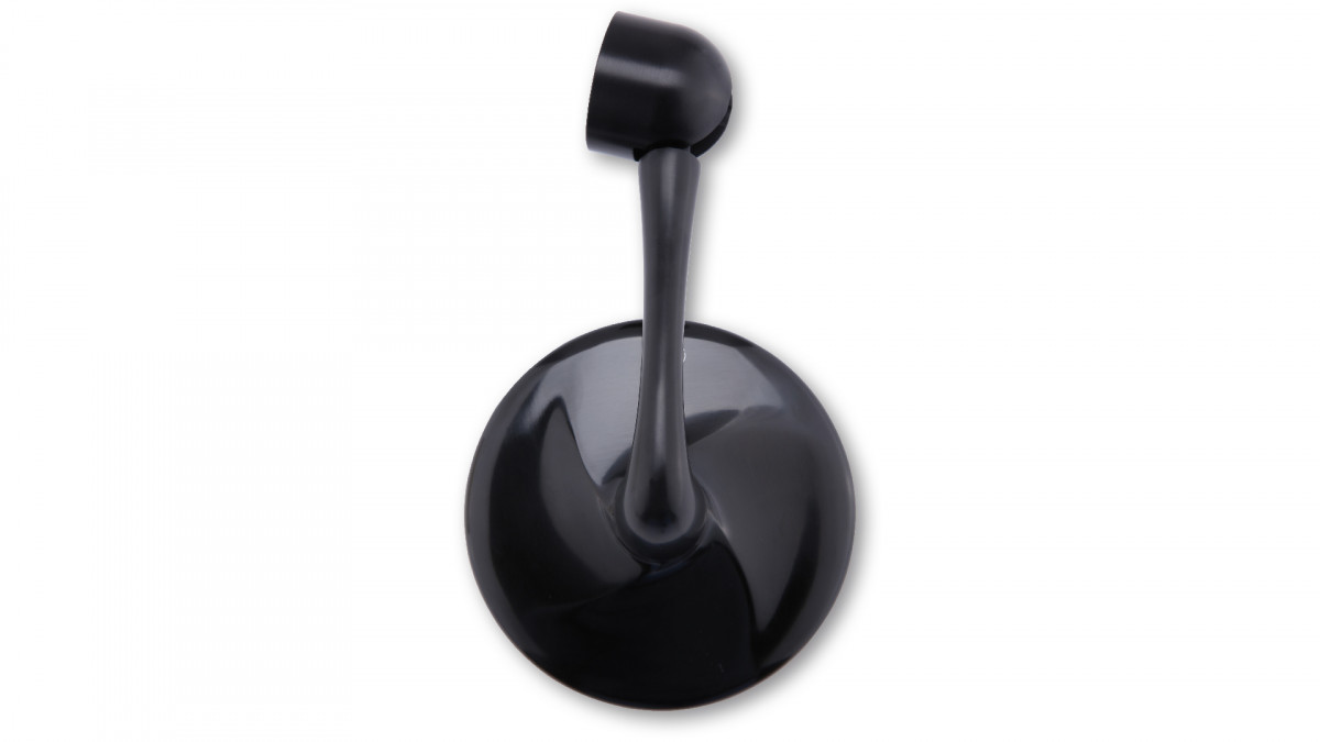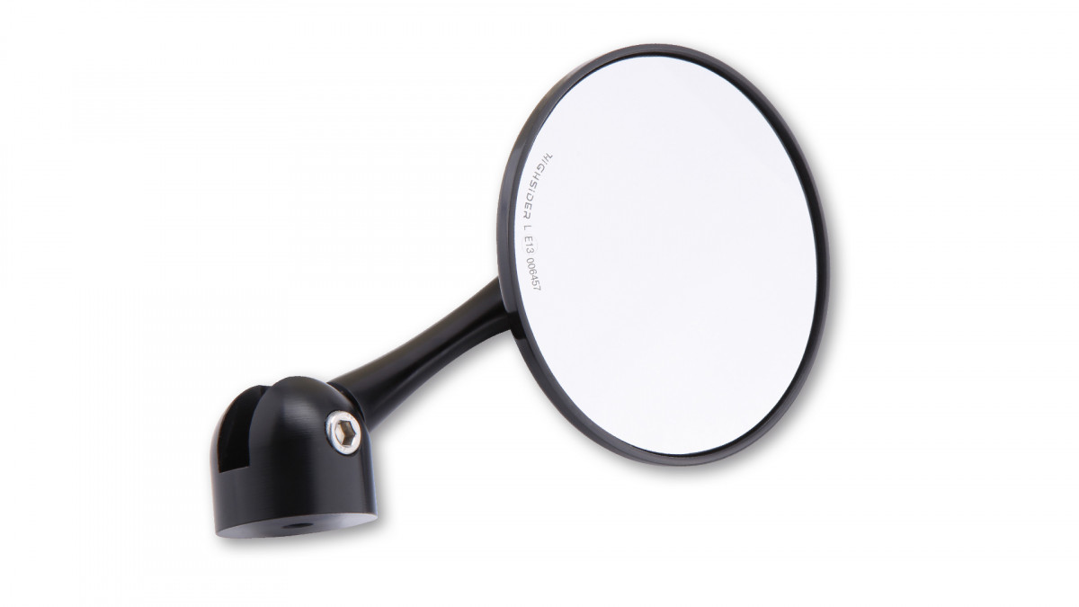 Rétroviseur de guidon fraisé CNC avec une tête ronde en aluminium de haute qualité, anodisé noir. L'hélice stylisée à l'arrière de la tête du miroir souligne le design inhabituel de ce modèle. Grâce à un système de serrage universel innovant, les rétroviseurs s'adaptent aux guidons d'un diamètre intérieur de 12 à 22 mm. La poignée est réglable de haut en bas pour une visibilité arrière et une sécurité encore meilleures. Utilisable pour le côté droit et gauche.