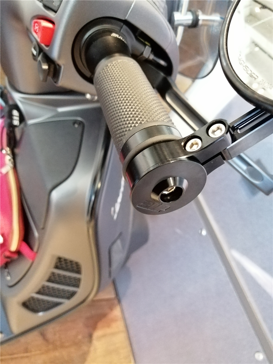 Pour monter les rétroviseurs d'extrémité de guidon, une poignée avec "ouverture d'extrémité de guidon" et un kit de montage sont nécessaires. Cela sert d'extension de guidon pour le montage des rétroviseurs. L'adaptateur est placé sur l'extrémité du guidon et fixé dans le guidon avec une vis M6. Les guidons des modèles Vespa GTS ont déjà un filetage M6 pour la fixation de l'adaptateur. Pour tous les autres modèles, un fil devra peut-être être recoupé. Deux kits de montage sont également nécessaires pour deux rétroviseurs d'extrémité de guidon. Fabrication de haute qualité en aluminium CNC, anodisé.