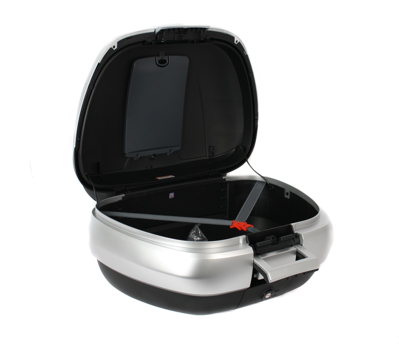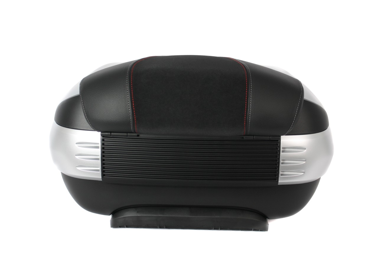 Spacieux, avec système de montage rapide. Offre de la place pour 2 casques modulaires. Coque supérieure peinte dans la couleur du véhicule, avec coussin dorsal confortable pour le passager, dans le même matériau et la même finition que la banquette. Poche pour documents à l'intérieur et bandes élastiques pour stabiliser les bagages