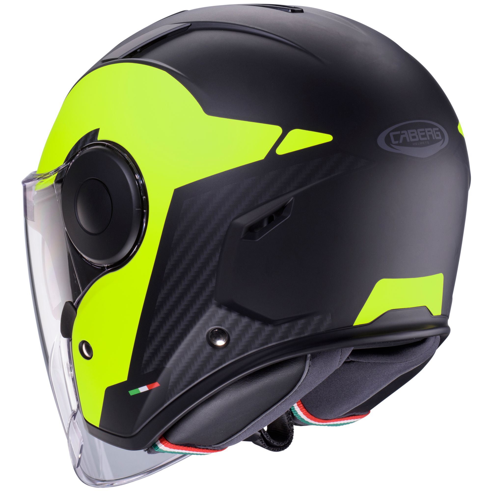 Le casque jet Caberg Soho avec le décor Milano dans les couleurs noir mat/jaune fluo possède les caractéristiques suivantes :