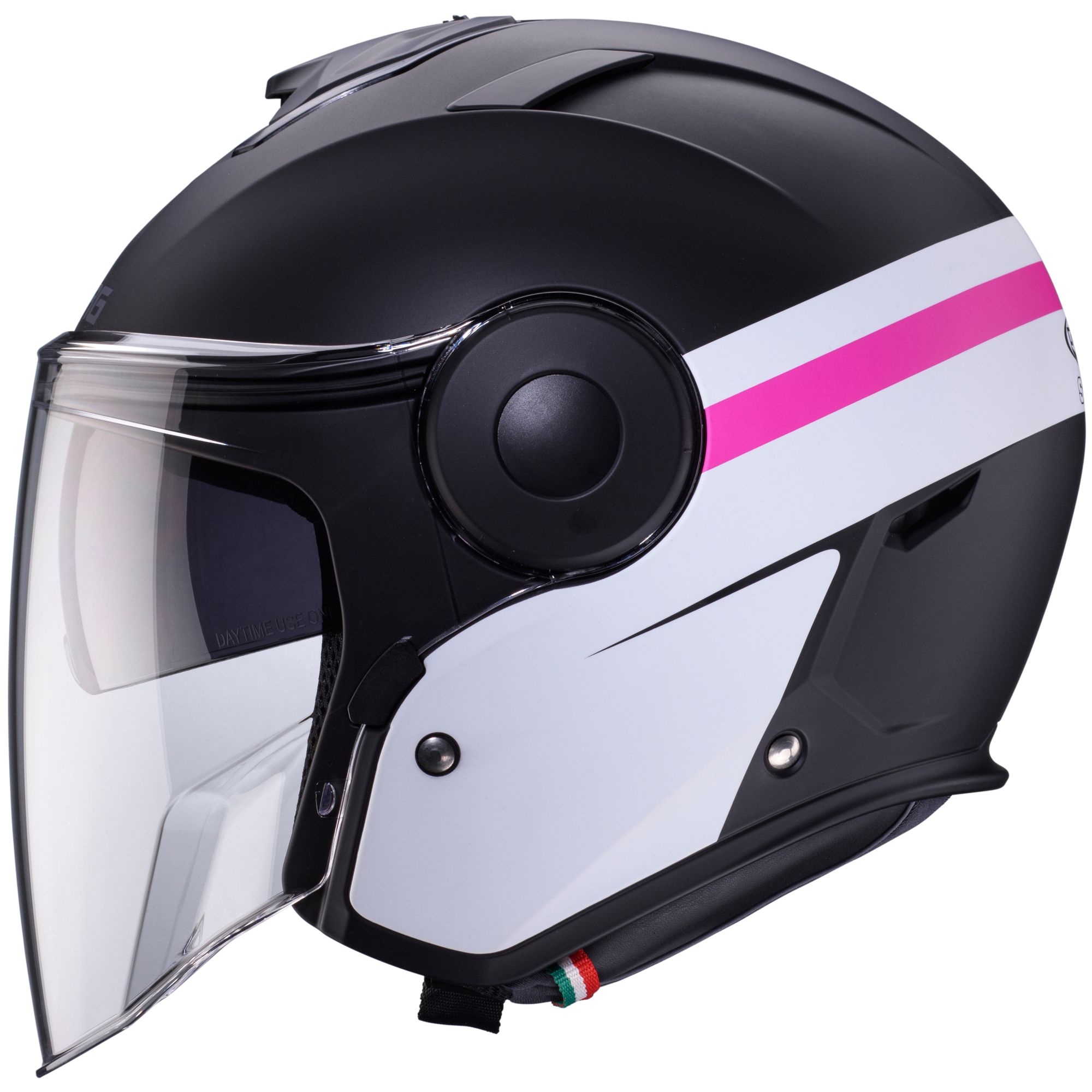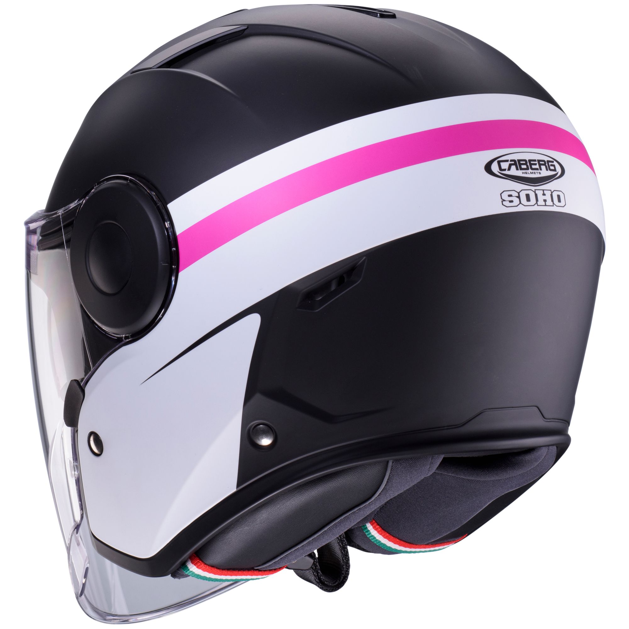 Le casque jet Caberg Soho avec le décor Zephyr dans les couleurs noir mat/blanc fuchsia possède les caractéristiques suivantes :