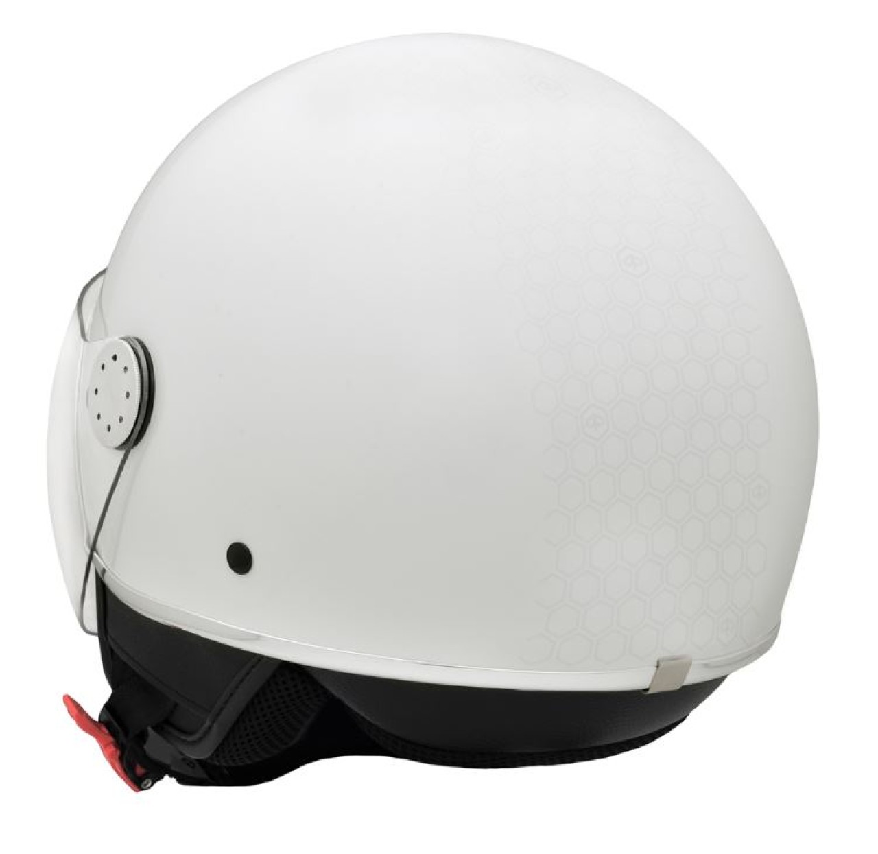 Casque Demi-Jet en matériau ABS avec éco-cuir cousu sur la coque, une visière transparente de 2 mm avec des caches en aluminium et un pare-soleil escamotable. Jugulaire avec fermeture micrométrique et anneau antivol. Matériau intérieur innovant et respirant, la doublure intérieure est amovible et lavable. Homologation ECE 22.06. Code couleur : BR_blanc montebianco / innocenza / 544